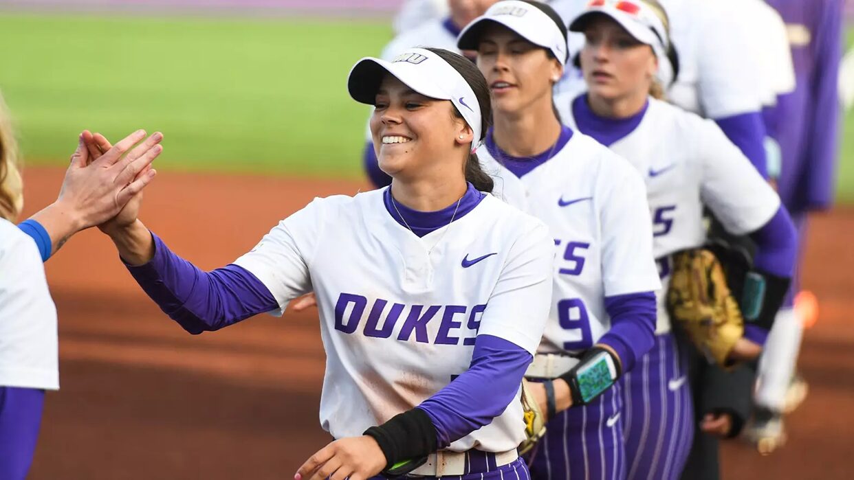 James Madison softball split the second day of the Lakeside Book Company Invitational with a six-home run performance against Buffalo after falling to Hofstra prior on Saturday at Veterans Memorial Park. The Dukes fell to the Pride, 3-2, before knocking off the Bulls in five innings, 14-3.